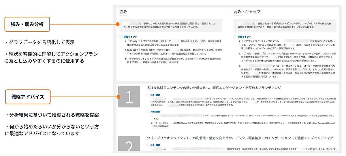 分析データをもとにAIが自社と競合の状況を総合的に整理したレポートを作成する。「強みとして伸ばすべき領域」「改善の余地がある領域」を客観的に示し、提案資料や社内での戦略検討に活用できる。生成AIの普及で高まった「AIに引用されたい」「AI Overviews(AIによる概要)に載りたい」というニーズに対応し、企業のマーケティング担当者やWebマーケティング会社に向けて、GEO対策機能を強化していく。