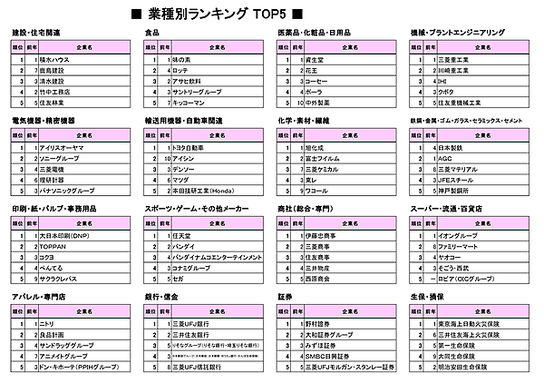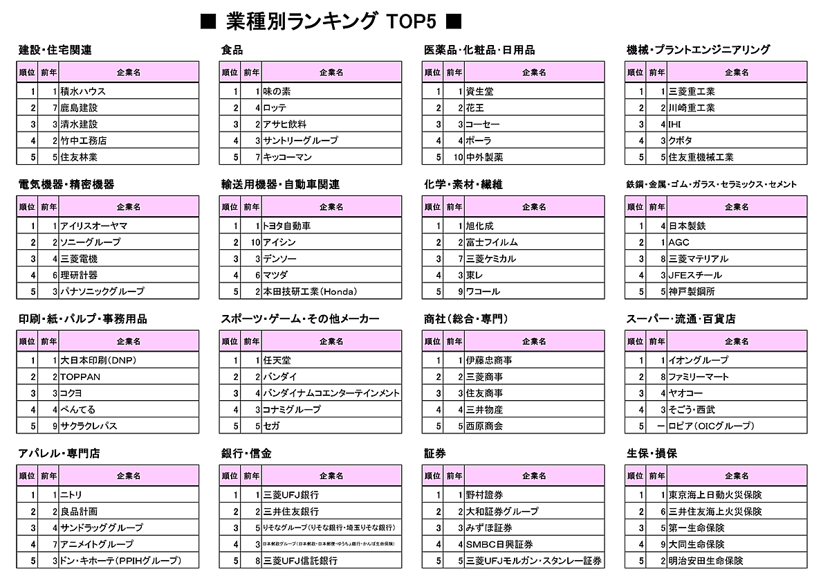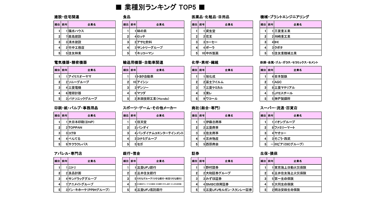 1位は「資生堂」、2位は「花王」と安定の顔ぶれ。「中外製薬」が前年10位から5位へ大きくランクアップし、医薬品メーカーとして唯一ランクインした。