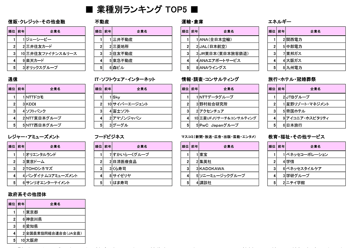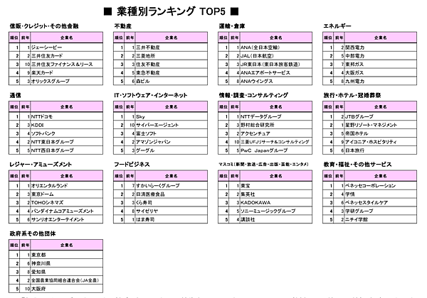 唯一すべての順位が入れ替わり、最も変動が大きかった業界。前年トップの「星野リゾート・マネジメント」と2位の「JTBグループ」が順位を入れ替え、「アイコニア・ホスピタリティ」(9位→4位)、「日本旅行」(6位→5位)も上位に入った。