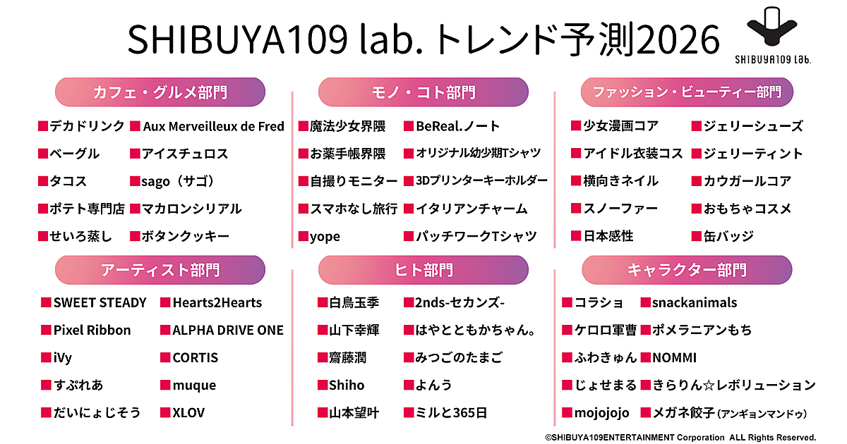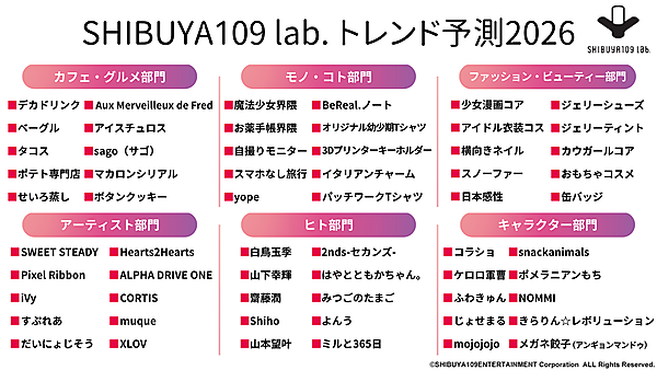 SHIBUYA109エンタテイメントが運営する若者マーケティング機関「SHIBUYA109 lab.」は、「SHIBUYA109 lab.トレンド予測2026」を発表した。15~24歳女性401名が回答している。
