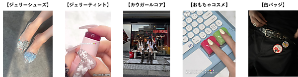 「おもちゃコスメ」や「缶バッジ」といったファッションアイテムに加え、「ジェリーシューズ」や「ジェリーティント」など、キラキラした可愛らしい質感のものが人気を集めている。