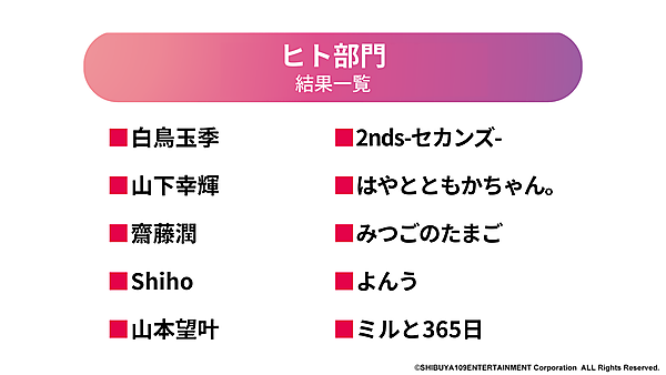 アーティスト部門では、アソビシステムの「KAWAII LAB.」から2024年に誕生した7人組ガールズグループ「SWEET STEADY(スイートステディ)」、VTuber事務所「にじさんじ」に所属する男子高校生アイドルグループ「すぷれあ」、韓国大手事務所「SMエンターテイメント」から5年ぶりにデビューした注目の新グループ「Hearts2Hearts(ハーツ・トゥー・ハーツ)」などが挙げられた。