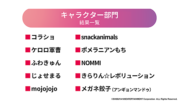 キャラクター部門では、平成を感じさせるキャラクターが話題に。「進研ゼミ小学講座」に登場するランドセルモチーフのキャラクター「コラショ」や、宇宙人であるケロロが主人公の漫画・アニメ『ケロロ軍曹』などの懐かしの作品から、「ふわきゅん」「じょせまる」「mojojojo」といったぬいぐるみまで幅広くノミネートされた。