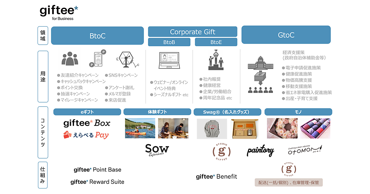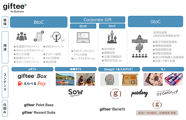 giftee for Businessは、アンケートの謝礼やキャンペーンの景品などにeギフトが利用できるサービス。コンビニ商品やカフェチケットなど約1000種類のギフトから贈呈された「ギフトポイント」内で好みの商品と交換可能な「giftee Box」や、各種のスマートフォン決済サービスのポイントから贈られるギフトポイント内で商品と交換できるデジタルギフト「えらべるPay」が活用されている。