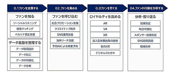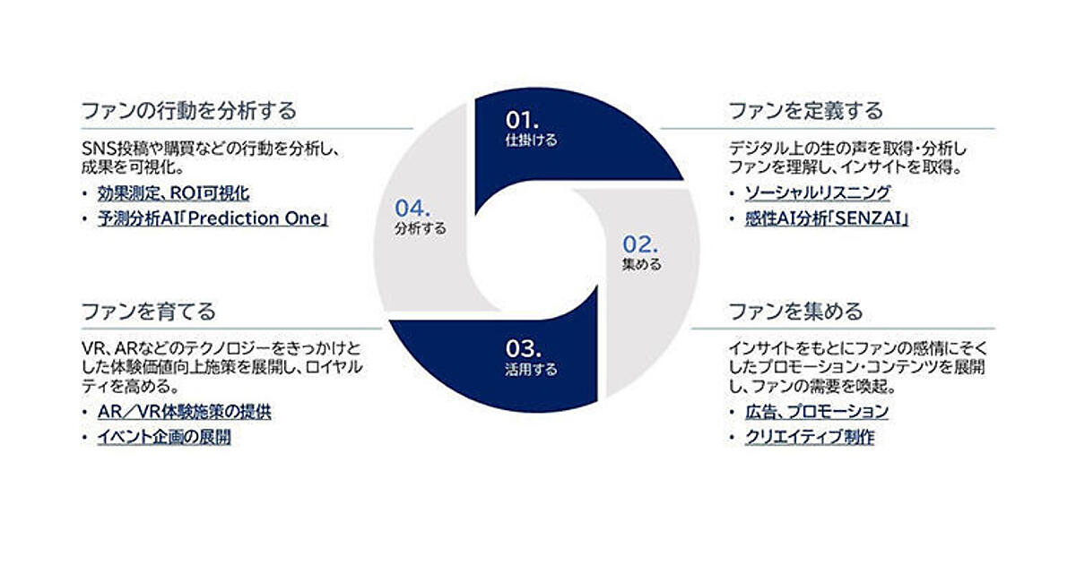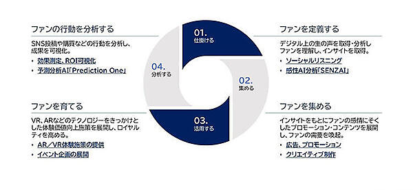 スポーツ、音楽、アニメなど熱心なファンが多い分野で一過性ではなく長期的な愛着につなげるマーケティングが重要になっているため提供する。SNS分析ツールを展開するノルウェーMeltwaterの日本法人、Meltwater Japanと連携し、同社が持つ世界中のSNSのデータと、ソニーネットワークコミュニケーションズのAI分析、VR(仮想現実)・AR(拡張現実)ソリューションを組み合わせる。