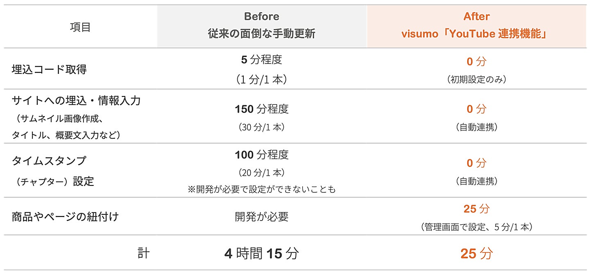 YouTube連携機能は、visumoの管理画面とYouTubeアカウントの連携で自動で動画を収集。YouTubeに登録しているタイトルやサムネイル、タイムスタンプなどの情報も同期される。手作業が不用になり、動画の更新・管理が効率化する。サイトを管理するウェブ部門が管理画面から動画を自由に選んで掲載できるため、マーケティング部門との調整・依頼などのコミュニケーションも迅速化する。