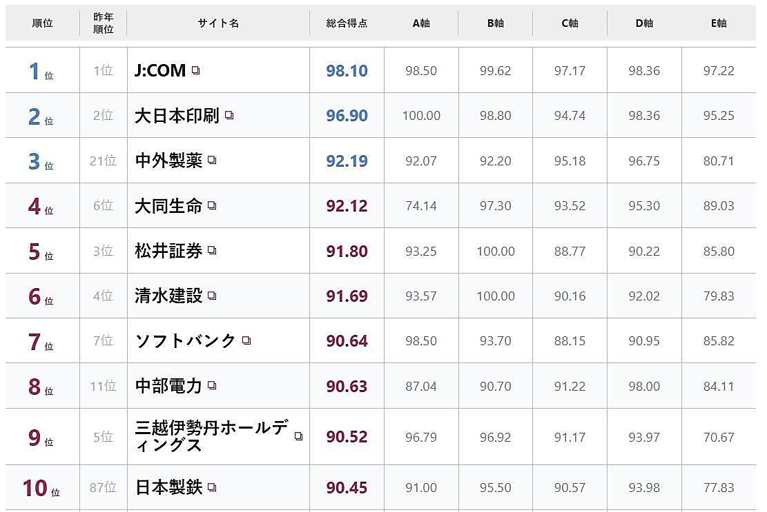 そのほかにも、「日本製鉄」(前年87位、今回10位)、「三菱UFJ信託銀行」(前年71位、今回20位)、「神戸製鋼所(前年140位、今回23位)」などもサイトリニューアルにより大幅にスコア/順位を上昇させている。