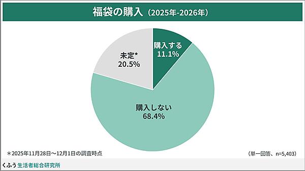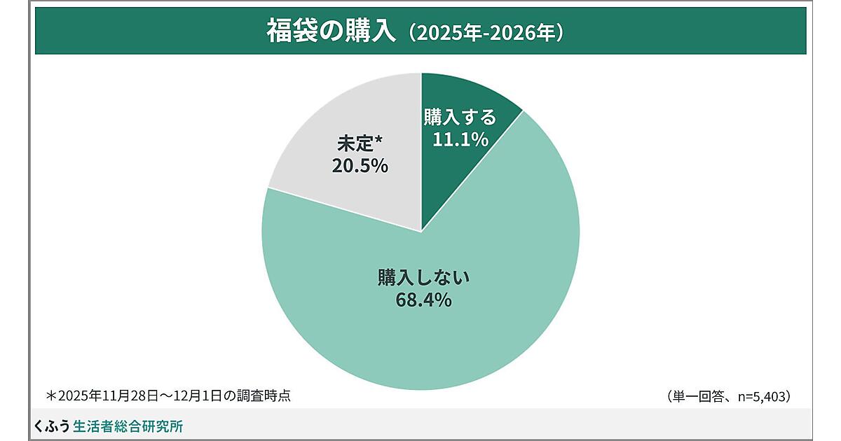 まず「くふう トクバイ」の契約企業35社に福袋について聞くと、7割を超える企業が年始の販促に福袋販売を予定していた。一方消費者側5403人に「福袋を購入するか/しないか」について聞くと、調査を行った2025年11月末~12月頭時点で、「購入する」と決めている人(購入済みを含む)が11.1%、「未定(これから検討する)」が20.5%。
