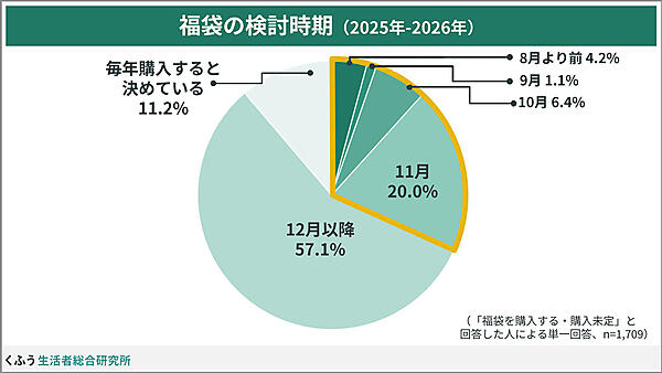 「福袋の検討時期」を聞くと、「8月より前」4.2%を筆頭に「9月」1.1%、「10月」6.4%、「11月」20.0%となり、実際の商戦時期の12月~1月以前に、3割超の人が11月までに検討(さらには購入)が済んでいることがあきらかとなった。