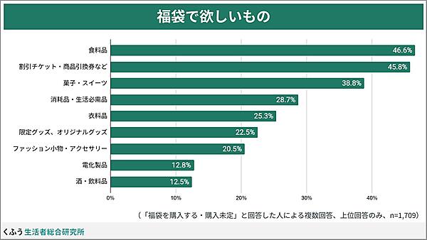 「福袋の中身」(欲しいもの、入っていたらうれしいもの)については、「食料品」46.6%が最多だが、「割引チケット・商品引換券」45.8%がほぼそれに並んで2位。3位は「菓子・スイーツ」38.8%だった。
