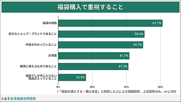 最後に「福袋購入時に重視すること」を聞くと、「価格」61.1%が大多数ながら、「好きなショップ・ブランドであること」50.6%、「中身がわかっていること」49.7%が多くあがる。価格の納得度に加え、何が当たるかわからないワクワク感以上に“好きなもの”“無駄にならないもの”が求められているようだ。