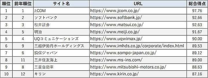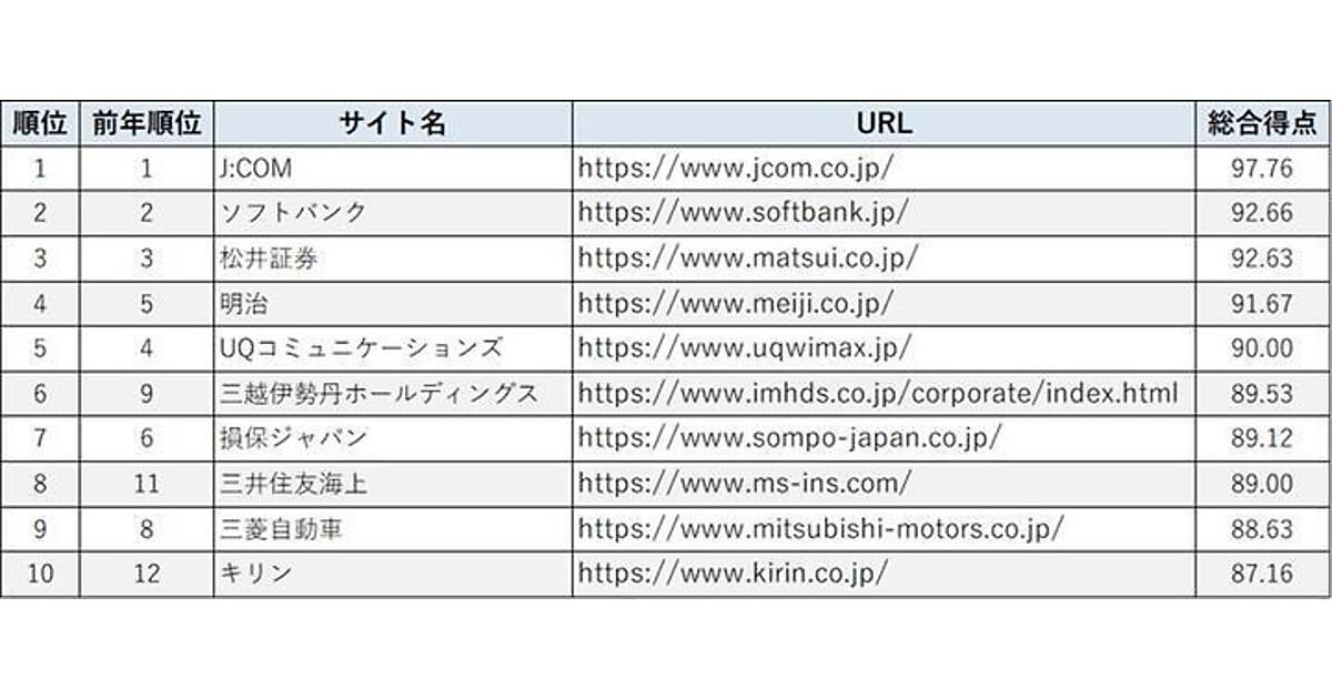 調査によると、ユーザビリティランキングの平均スコアは81.65点で、前年より0.23ポイント上昇した。1位は「J:COM(97.76点)」で、昨年に続きPCサイトランキングとあわせてトップを獲得。「ソフトバンク(92.66点)」や「UQコミュニケーションズ(90.00点)」など、情報通信業の企業が多く上位に入った。また、「三井住友海上(89.00点)」は昨年11位→8位、「キリン(87.16点)」は昨年12位→10位と順位を上げた。