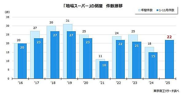 調査によると、2025年1~11月の「地場スーパー」の倒産が22件で、前年同期の15件から46.6%増となった。すでに前年の年間件数(18件)を超えており、コロナ禍以降で最高だった2023年の25件を抜く可能性もある。