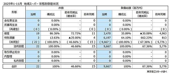 倒産の形態別では、破産が19件(前年同期比72.7%増)で、全体の9割近く(86.3%)を占める。この他は特別清算が3件(同25.0%減)だった。地場スーパーの倒産は、2年連続ですべて消滅型が占めることとなった。なお原因別では、販売不振が19件(前年同期比46.1%増)と86.3%を占めたとのこと。