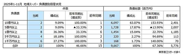 負債額別では、1億円以上が12件(前年同期比20.0%増)で、全体の54.5%を占めた。そのほかは「1千万円以上5千万円未満」が6件(同100.0%増)、 「5千万円以上1億円未満」が4件(同100.0%増)となっている。