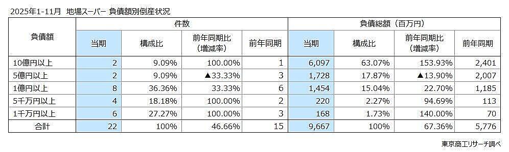 東京商工リサーチ(TSR)は、「地場スーパーの倒産」に関する調査結果を発表した。2025年1~11月に倒産した地場スーパー22件について分析している。