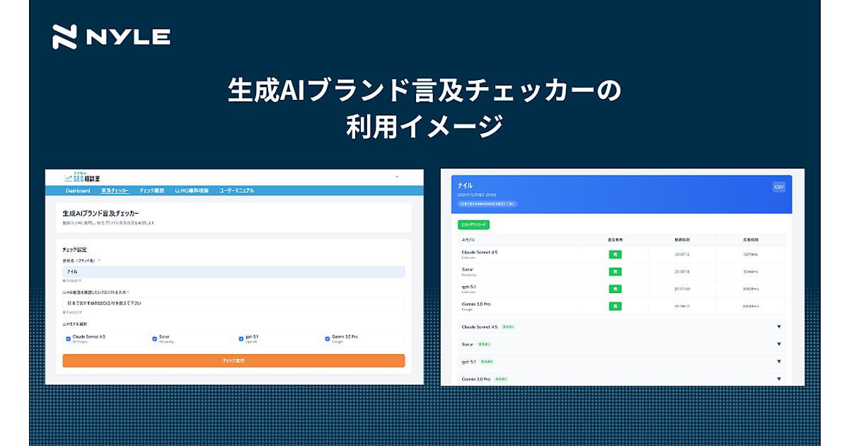 マーケティングDX(デジタル変革)や自動車産業DX事業を展開するナイルは、「ChatGPT」や「Perplexity」などの主要な生成AIで、特定のプロンプト(質問)に対する回答に自社ブランドやサービス・商品が言及されているかを効率的に調査できる簡易ツール「生成AIブランド言及チェッカー」を無料公開したと12月23日に発表した。自社や競合のブランド名と、確認したいプロンプトを入力し、対象の生成AIを選ぶシンプルな操作でチェックできる。