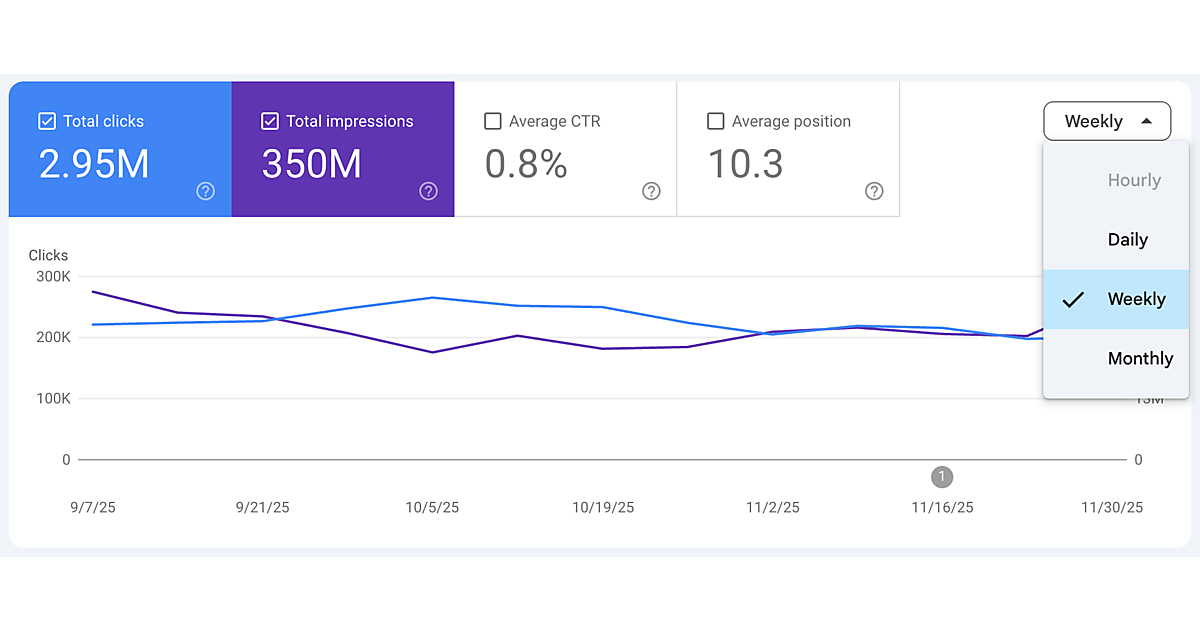 Googleは、提供しているインターネット検索分析ツール「Google Search Console」の「検索パフォーマンスレポート」に「週単位と月単位のビュー」を追加したと12月10日に発表した。これまでレポートは「日単位」のデータのみだったが、新たに「週単位」と「月単位」の粒度を選べるようにした。日々の変化を平滑化して、Webサイトへのトラフィックの全体的な傾向に焦点を当てることができる。