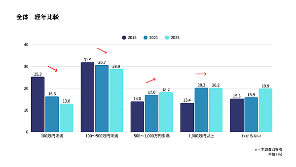 まず、この10年での貯蓄総額の変化を見ると、100万円未満の「低貯蓄層」の割合は25.3%から13.0%へと大幅に減少しており、全体的な貯蓄額の底上げが見られた。「100~500万未満」も微減した一方で、「500~1,000万未満」は右肩上がりとなった。