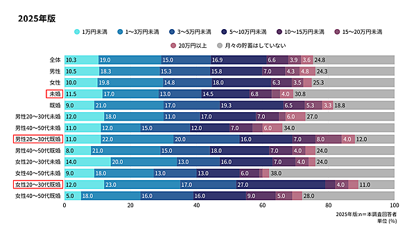 属性別に見ると、未婚層では「貯蓄をしていない」と回答した人が30.8%と高い水準に。一方、「20~30代の既婚男性・既婚女性」では貯蓄なしの割合が大きく下がり、若年の既婚層ほど資産形成への意識が高いことが明らかになった。