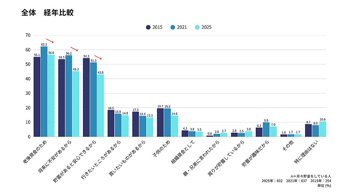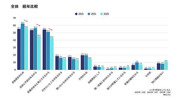 貯蓄をする理由を聞くと、「老後資金のため」が56.6%で最も多く、ついで「将来に不安があるから」が45.2%、「貯蓄があると安心できるから」が43.0%と続いた。いずれも2021年調査と比べると減少傾向にあり、コロナ禍明けで消費行動が活発化しつつあることがうかがえる。なお、「貯蓄があると安心できるから」は男性よりも女性の方が14.2ポイント高く、男女で差が見られた。