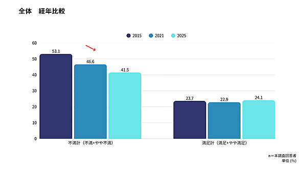 最後に、自身の収入に対する満足度を聞くと、「不満・やや不満」の合計は41.5%で、この10年で徐々に減少していることがわかった。一方で、「満足・やや満足」の合計は24.1%にとどまり、ほぼ横ばいとなった。
