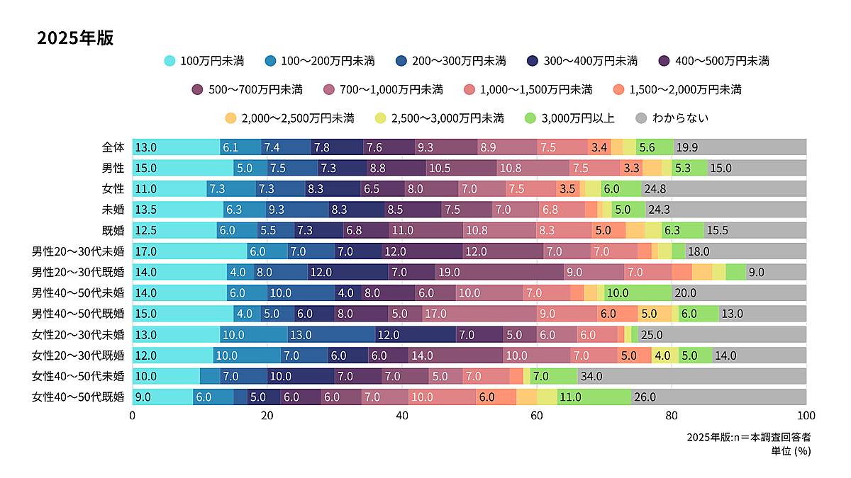 貯蓄総額を詳しく見ると、依然として「100万円未満」が最も高い割合を占めた。男女別で見ると、男性は「500万円以上」の中~高額帯が相対的に多く、女性は「500万円未満」にやや集中する傾向が見られた。年代別で見ると、20~30代は既婚・未婚問わず少額帯が中心だが、40代以降は「1,000万円以上」にも分布が広がっている。