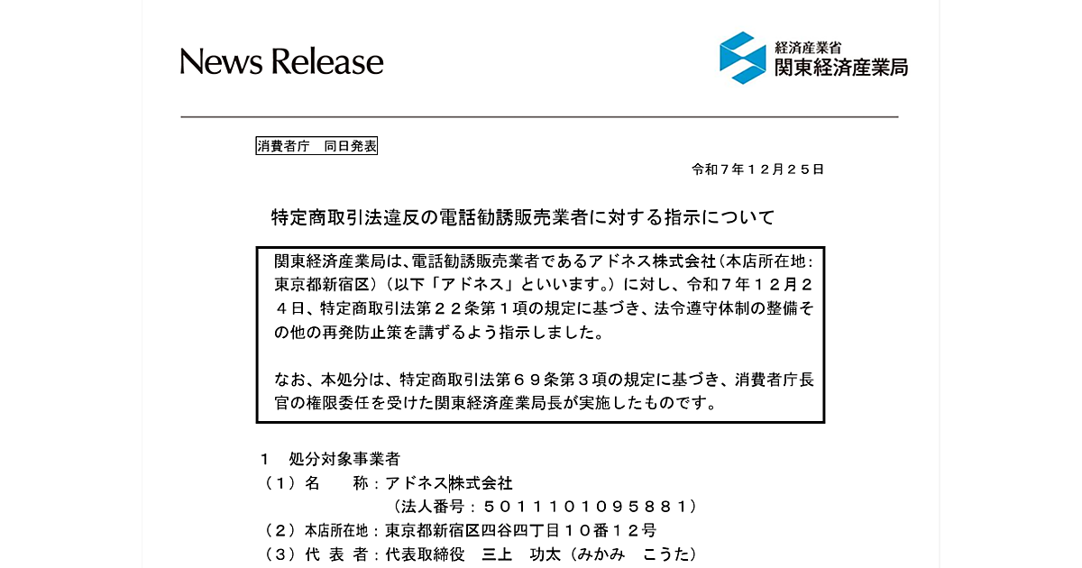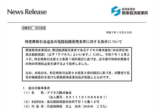 経済産業省の関東経済産業局は12月25日、SNS運用やAI活用ビジネスのオンラインスクール事業のアドネス(東京都新宿区)に対し、特定商取引法違反(適合性原則違反)で12月24日付で行政処分を行ったと発表した。法令遵守体制の整備と再発防止策の実施を指示した。行政処分は消費者庁長官から権限委任を受けた関東経済産業局長が実施した。