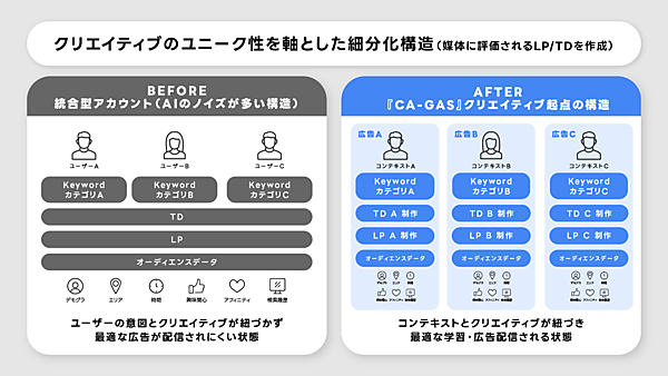 インターネット広告事業のサイバーエージェントは、ユーザーの多様化・複雑化する検索意図(インテント)に対応する生成AI(人工知能)を活用した新たな広告手法「生成AIアカウント構造『CA-GAS(Cyberagent Generative Account Structure)=シーエーギャス』」を開発し、提供を始めた、と1月5日発表した。広告効果を最大化する新しい配信構造で、クリエイティブを起点にしている。