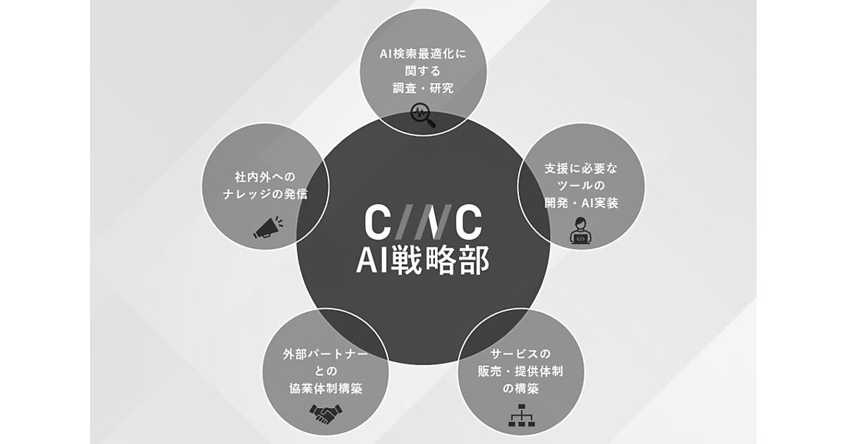 AI戦略部はCINCのコンサルティングとプロダクトの中核となり、AI検索最適化を現在の最重点分野に位置付け、技術開発からサービス実装までの役割を持つ。①AI検索最適化に関する調査・研究②収益性とサービス品質を向上させるための社内ツール開発・AI実装③サービスの販売・提供体制の構築④外部パートナーとの協業体制構築⑤研究開発で得られた知見の社内外への発信--を行う。