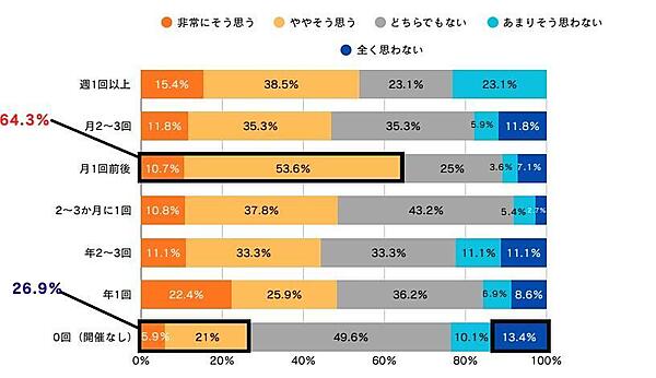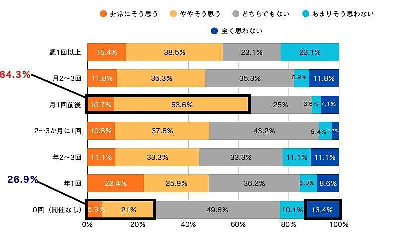 あわせて「今の職場で働き続けたいと思うか」を聞き「飲み会の開催頻度」と合わせて見ると、「月1回前後」開催されている層が、就業の継続意向(非常にそう思う+ややそう思うの合計)が64.3%ともっとも高かった。一方、「0回(開催なし)」の層では26.9%と大きく下回り、「まったく思わない」の割合も最多だった。