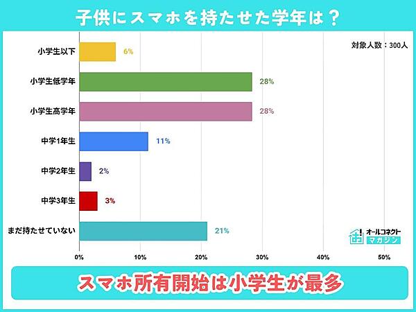 まず、子どもにスマホを持たせた学年を聞くと、「小学生低学年(1~3年)」と「小学生高学年(4~6年)」がいずれも28.33%で、同率1位となった。合計すると56.66%が小学生のうちにスマホを持ち始めており、「中学生(1~3年)」の約3.5倍にのぼることがわかった。一方で、「まだ持たせていない」も21.00%存在した。