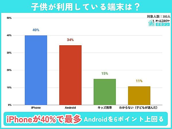 子どもが利用している端末の種類を聞くと、「iPhone」が40.00%、「Android」が34.33%となり、iPhoneがやや優勢だった。理由としては、「ファミリー共有やスクリーンタイム機能で親が管理しやすい」「周囲の友だちがiPhoneを使っている」といった意見が見られた。一方で、「キッズ携帯」は15.00%にとどまった。