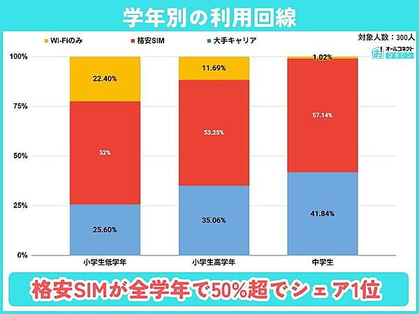子どものスマホの利用回線を見ると、「格安SIM」が全学年で過半数を占め、圧倒的なシェアとなった。ドコモ・au・ソフトバンクなどの大手キャリアと比較すると約1.4倍にのぼり、通信費を抑えたい傾向が強いことがうかがえる。また、「Wi-Fiのみ」の利用は年齢が上がるにつれて大きく減少していた。