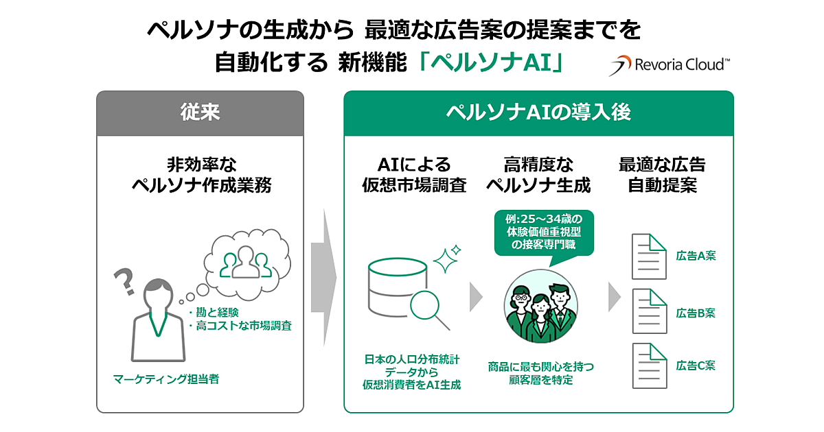 Revoria Cloud Marketingは、集客から顧客獲得までのプロセスを一元管理・最適化し、マーケティング業務を効率化するプラットフォームで、成果の最大化を支援。AI技術を搭載している。ペルソナAIは、日本の人口分布統計データを学習したAIモデルで仮想消費者に市場調査を行い、データに裏付けられたペルソナを生成。AIの活用によって数百~数千人分の回答データが取得できる。