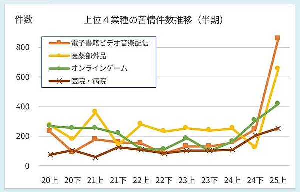 業種別で見ると、「電子書籍・ビデオ・音楽配信」「医薬部外品」「オンラインゲーム」がトップ3でその数も増加している。「クレジットカード」は「医院・病院」に次ぐ5位だが、その増加率は前年同期比で1185.7%と急激に増加した。また「医薬部外品」については、特定の1社に479件の苦情が寄せられたという。全体的にも一部の広告主に苦情が集まる傾向が見られた。