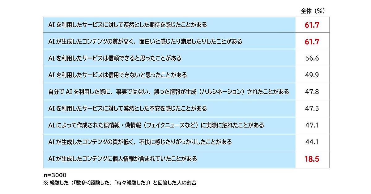 一方で「AIを利用したサービスは信用できると思ったことがある」56.6%と「AIを利用したサービスは信用できないと思ったことがある」49.9%はほぼ半々でそれに続く。ハルシネーションによる誤情報、不安感、偽情報(フェイクニュース)を危惧する人も多い。さらに「AIが生成したコンテンツに個人情報が含まれていたことがある」も18.5%と見逃せない数値となっている。