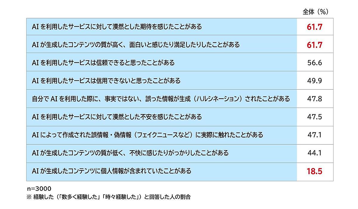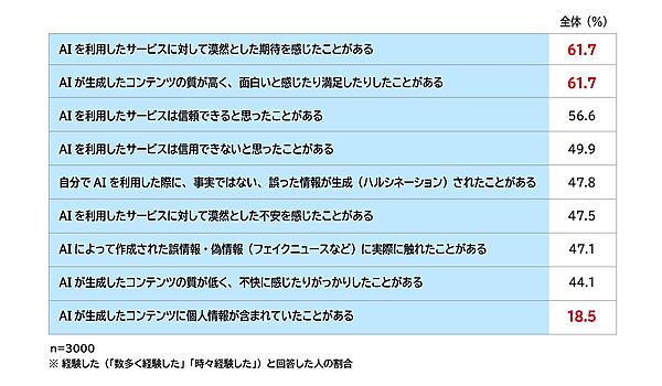 まず「AI利用にともなう経験」について聞くと、「AIを利用したサービスに対して漠然とした期待を感じたことがある」「AIが生成したコンテンツの質が高く、おもしろいと感じたり満足したりしたことがある」がともに61.7%と6割を超えた。