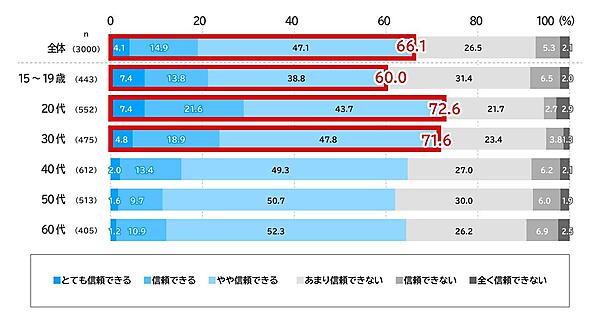 「ニュースや新しいトピックを知る際にAIの情報を信頼しているか」どうかについて聞くと、「とても信頼できる+信頼できる+やや信頼できる」の合計は66.1%。世代別では、20代が72.6%、30代が71.6%と比較的若年層が高いが、逆に15~19歳は60.0%と全世代のなかでもっとも信頼度が低かった。