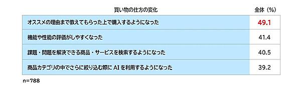 また「AI利用の前後でもっとも買物の仕方が変わったこと」では、「オススメの理由まで教えてもらった上で購入するようになった」49.1%が最多で、「機能や性能の評価がしやすくなった」「課題・問題を解決できる商品・サービスを検索するようになった」なども4割を超える。