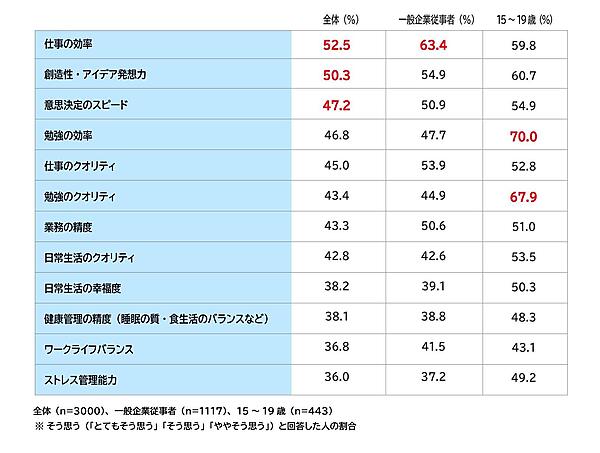 「AIを利用することで向上したこと」を聞くと、「仕事の効率」52.5%、「創造性・アイデア発想力」50.3%、「意思決定のスピード」47.2%が上位。「仕事の効率」は一般企業従事者だと6割を超える63.4%に達していた。なお15~19歳では「勉強の効率」が向上したと考える人が70.0%、「勉強のクオリティ」が向上したと考える人が67.9%だった。