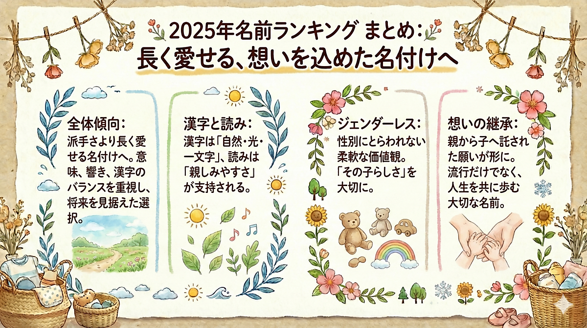 同社では、2025年の名付けトレンドについて、次の4つのポイントを挙げている。多様性を尊重しつつ、日常生活の中で心地よく使え、親しみやすさを感じられる名前を選ぶ家庭が増えているようだ。