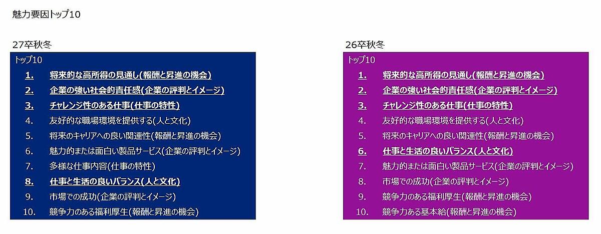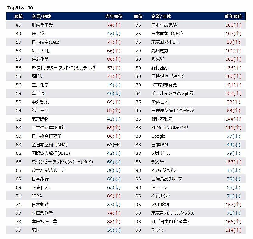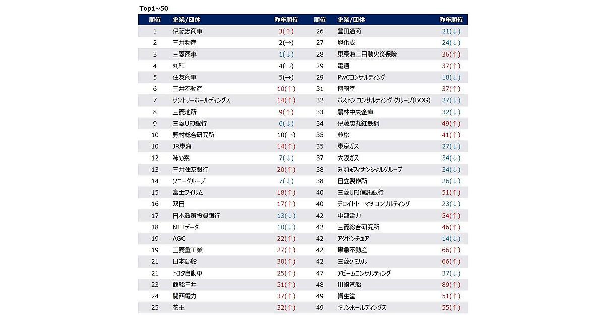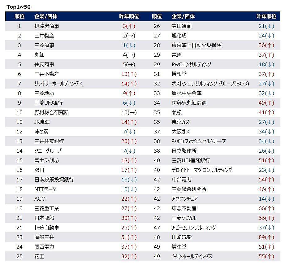 ランキング上位には、不動産の三井不動産(6位)、食品のサントリーホールディングス(7位)、銀行の三菱UFJ銀行(9位)、コンサル・シンクタンクの野村総合研究所(10位)、運輸のJR東海(10位)、電子・電気機器のソニーグループ(14位)、輸送用機器のトヨタ自動車(21位)、電力の関西電力(24位)、損害保険の東京海上日動火災保険(28位)、広告の電通(29位)など、各業界のトップ企業の名前があがっており、「業界」でなく「業界代表」の安定企業への志向が見られる。全体的な傾向としては、不動産・運輸・インフラの躍進、コンサル業界の低下が見られる。