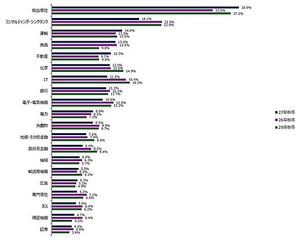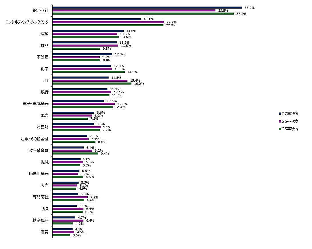 2027年卒 秋冬期 就職人気企業ランキング(1位~100位抜粋)を見ると、1位は前年3位の「伊藤忠商事」、2位は前年ランクを維持して「三井物産」、3位は前年1位だった「三菱商事」だった。以下、4位「丸紅」、5位「住友商事」が続いており5大商社が独占した。5大商社への得票シェアも、前年の33.5%から38.9%と約5%上昇している。