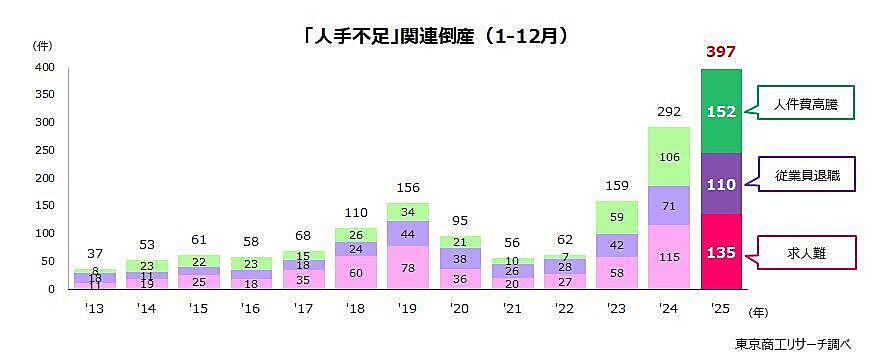調査によると、2025年の「人手不足」関連倒産の件数は397件(前年比35.9%増)で、過去最多を更新した。要因別では、「従業員退職」が110件(同54.9%増)、「人件費高騰」が152件(同43.3%増)といずれも大幅に増加。特に十分な賃上げが難しい中小企業では、人材流出が深刻化していた。