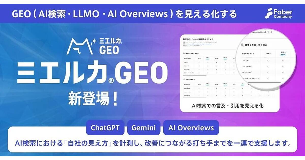 Webマーケティング支援のFaber Company(ファベルカンパニー)は、生成AI検索の「Google AI Overviews」や「ChatGPT」「Gemini」で自社ブランドの表示状況を可視化・分析する新ツール「ミエルカGEO(ジーイーオー)」の提供を始めたと1月14日に発表した。新たなマーケティング概念「GEO(Generative Engine Optimization:生成AI検索最適化)」や「LLMO(Large Language Model Optimization:大規模言語モデル最適化)」に対応した。