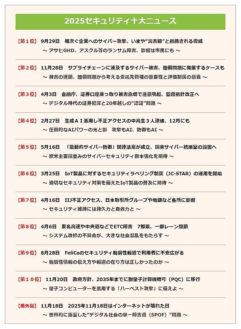 2025年の十大ニュースとしては「相次ぐ企業へのサイバー攻撃、いまや“災害級”と指摘される脅威」が1位となった。たとえばアサヒグループホールディングスやアスクルの被害は、歳末商戦への影響、医療関連資材の配送停滞など、当該企業はもちろん、関連企業、さらに一般市民にまで影響を与えた。
