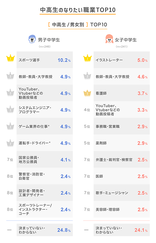一方、女子中学生の1位は「イラストレーター」(5.0%)で、2位は「教師・教員・大学教授」(4.6%)、3位は「看護師」(3.7%)と続き、トップ3は2025年調査と同じ顔ぶれとなった。