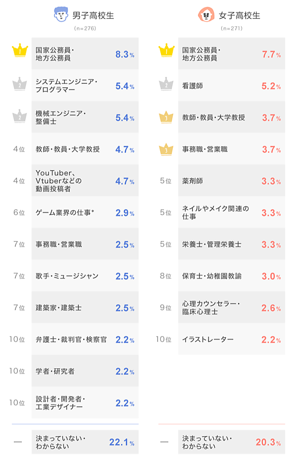 男子高校生では、2位に「システムエンジニア・プログラマー」「機械エンジニア・整備士」(5.4%)が同率でランクイン。女子高校生では、2位に「看護師」(5.2%)、3位には「教師・教員・大学教授」「事務職・営業職」(3.7%)が並び、資格職や安定した職種への人気が目立った。