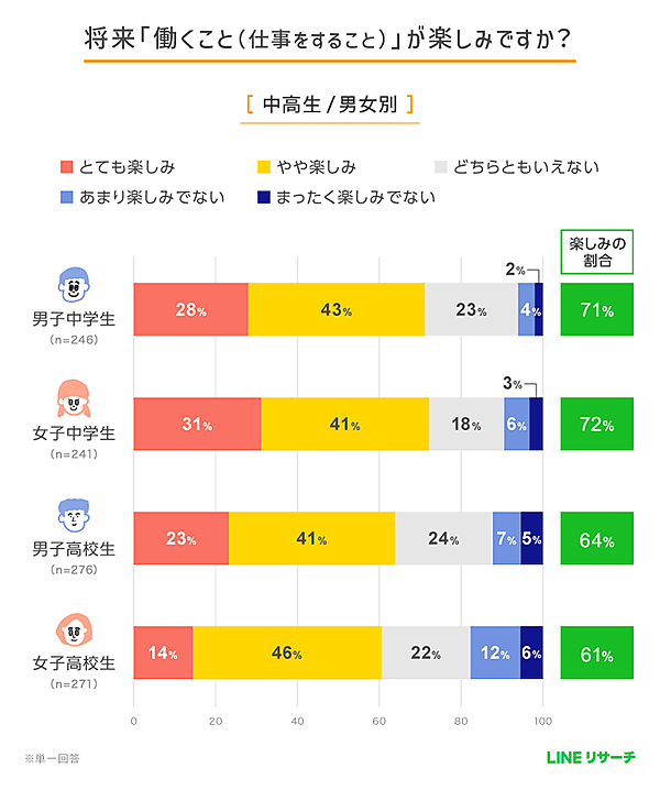 最後に、将来「働くこと」が楽しみかどうかを聞くと、中高生ともに「やや楽しみ」が最も高い割合となった。「とても楽しみ・やや楽しみ」を合わせた割合は、中学生では7割強、高校生では6割強となり、多くの中高生が仕事に対してポジティブな気持ちを抱いていることがわかった。